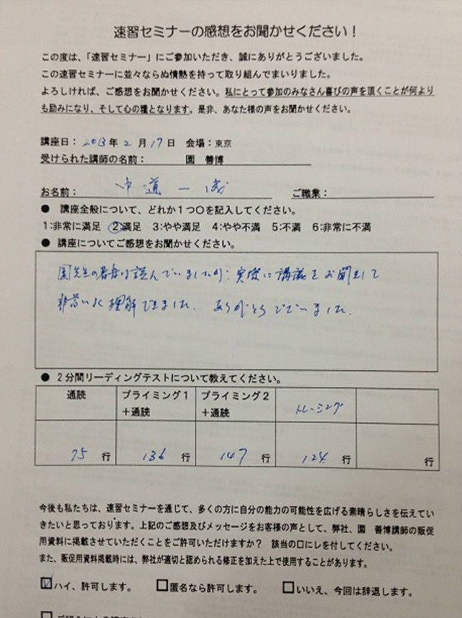 園先生の速習法はただ速く読むだけでなく、短い時間で必要な情報を吸収し、活用できる方法です。しかも誰でも簡単にできる方法!!これからもこの速習法でステップアップしていきたいと思います。ありがとうございました。